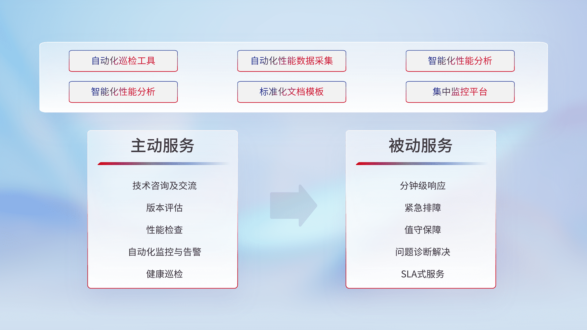 智能化工具和标准化文档,,,,保障服务质量,,,,提供主动服务(包含技术咨询、、版本评估、、、性能检查、、自动化监控与告警、、健康巡检)和被动服务包含(分钟级响应、、、紧急排障、、、值守保障、、问题诊断解决、、、、SLA服务)。。。