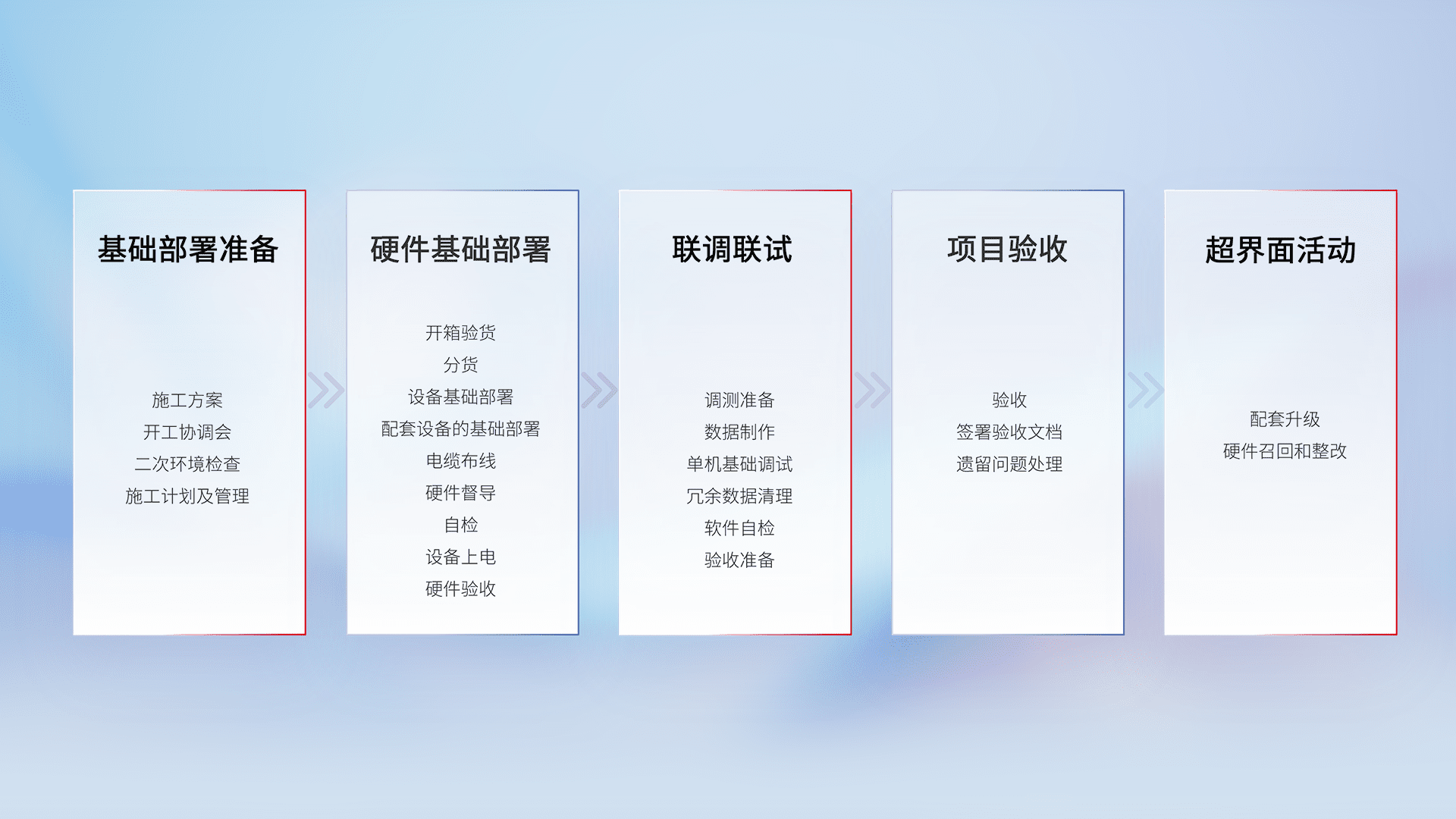 从基础部署准备、、、硬件基础部署、、、、联调联试、、、、项目验收、、、越界面活动的全过程可追溯,,,保证施工质量和进度。。。
